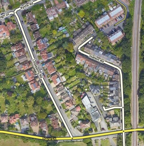 References to Titts Farm date back to 1743, but it was likely much older than this. The farm was broken up and the land auctioned off in lots for development purposes between 1908 and 1910. It comprised some 35 to 40 acres covering the area that now contains Station Road, Loseberry Road, Raleigh Drive and Rythe Road, with the railway line, Hare Lane, Hare Lane Green and the River Rythe as its approximate boundaries. In earlier years the farm probably extended further eastwards to embrace most, if not all, of Lambs Hill, and thus one of the Oaken Lane brickfields: there are references in old deeds to the payment of an annuity of £20 during the lifetime of one owner in lieu of forgoing a one-third royalty on 'unexhausted brick earth'. It also seems likely that one or two fields lying on the other side of Hare Lane may have formed part of this farm.